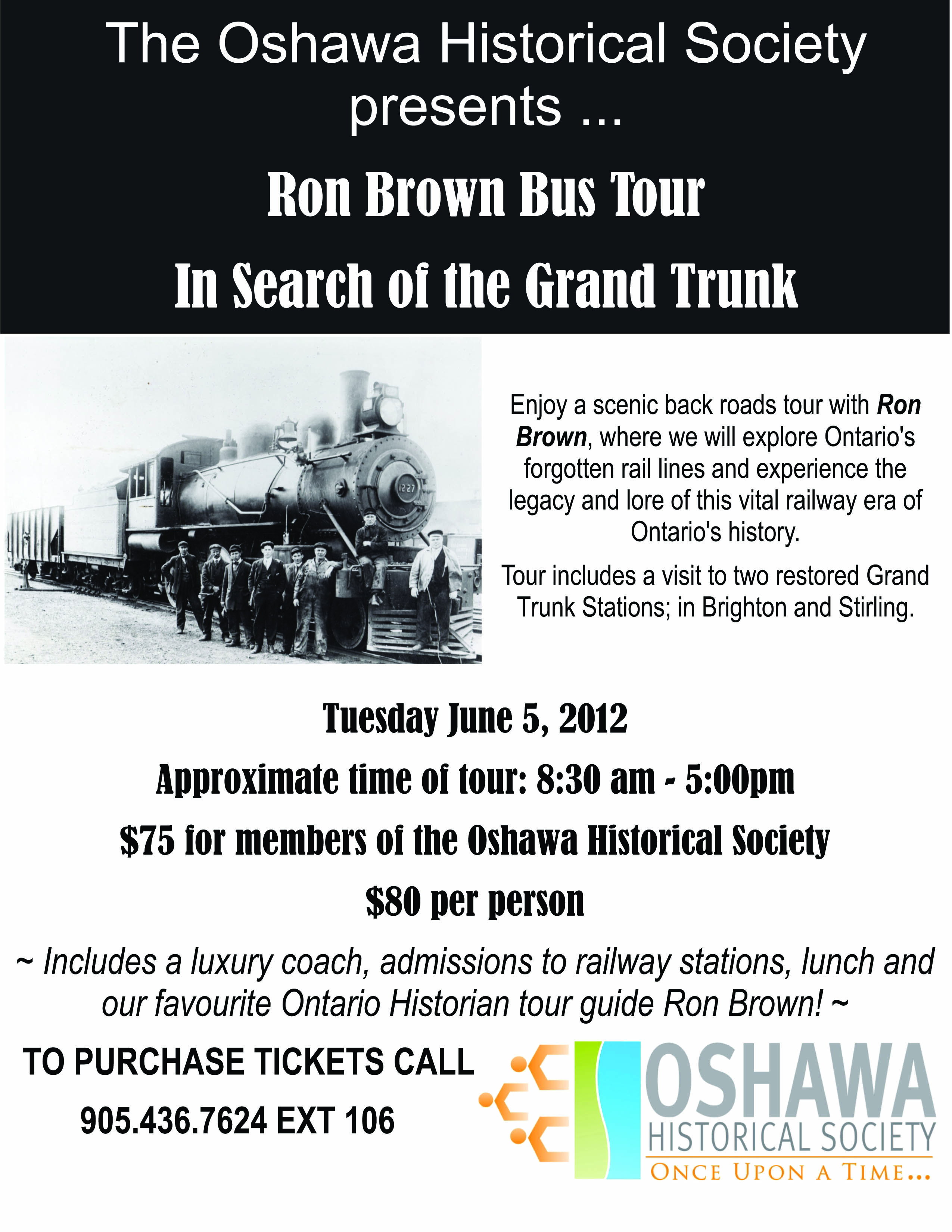 The Oshawa Historical Society is pleased to announce that we have booked an upcoming Ron Brown Tour! Please see the picture below for information, and should you have any further questions, please contact the Oshawa Community Museum at 905-436-7624 x 106.