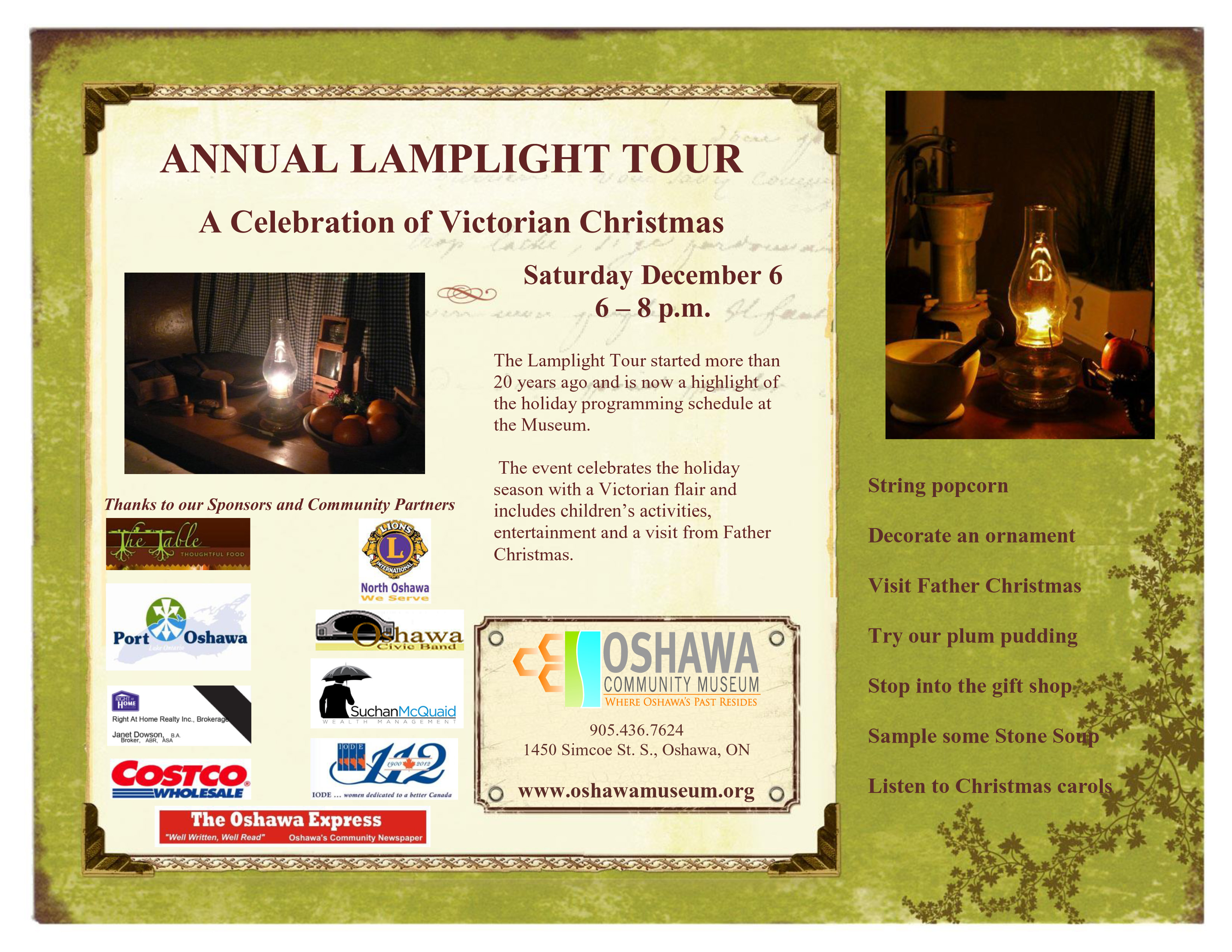 Our Annual Lamplight Tour is on Saturday, December 6, 2014, from 6-8pm at the Oshawa Community Museum; 1450 Simcoe Street South, Lakeview Park. Regular tour rates apply, or free for Oshawa Historical Society Members.